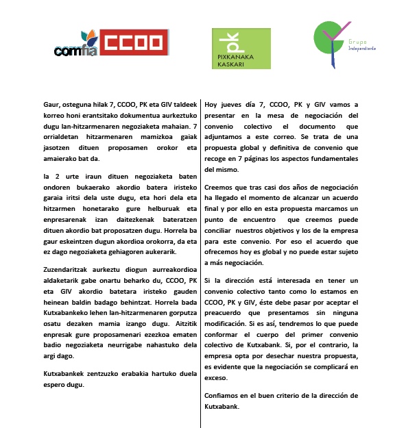 Ayer, en la reunión de la mesa negociadora del I Convenio Colectivo de Kutxabank, tras la presentación por parte de PK-GIV y CCOO de una propuesta cerrada de preacuerdo que anticipamos a la plantilla, se produjo a última hora de la mañana la aceptación de la misma por parte de la empresa.