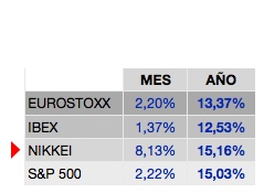 Seguimos tirando para arriba con claridad por segundo mes consecutivo y mientras la renta fija sigue con el electroencefalograma plano nuevamente es la renta variable, con un peso del 25% en nuestra cartera, la que tira del carro cosa fina. Si el mes pasado destacaba la bolsa europea, en octubre ha sido la japonesa la que se ha apuntado un 8% de subida.