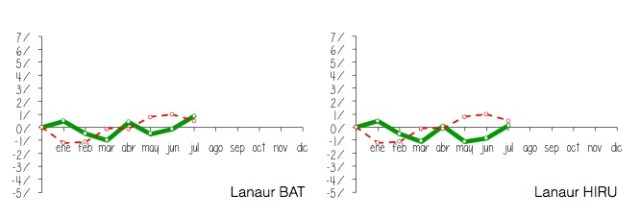 Durante el mes de julio se ha confirmado la recuperación apuntada en las primeras sesiones del mes y a 31 de julio las dos lanaur se han situado en positivo. El IPC en cambio ha frenado su racha de 4 meses con subidas consecutivas y se situa en el 0,5% de subida desde enero en el ámbito de Euskadi (0,4% para el conjunto del estado).