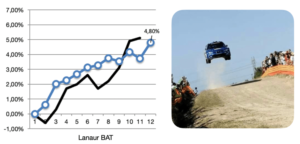 | Urte amaierako rallya. Errenta aldakorreko merkatuek nabarmen berreskuratu dute azaroan galdutakoa, Ibex-35ek izan ezik. Errenta finkoari dagokionez, egoera konplexua izan da, eta hala jarraituko du izaten, inbertitzailearentzat. Azkenean, urtea ona izan da taldeko BGAE guztietan, eta azken 5 urteetan baino errentagarritasun handiagoarekin itxi dute. Los resultados al cierre de diciembre son: Lanaur BAT: 4,80% IPC (Eus): 5,10% (noviembre) | Rally alcista de final de año. Los mercados de renta variable recuperan ampliamente lo perdido en el mes de noviembre excepto el Ibex-35. Por el lado de la renta fija el panorama sigue siendo complicado para el inversor. Al final el año ha sido bueno en todas las EPSV del grupo y han cerrado con rentabilidades por encima de las obtenidas en los últimos 5 años. Los resultados al cierre de diciembre son: Lanaur BAT: 4,80% IPC (Eus): 5,10% (noviembre) |